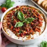 Add a sprinkle of freshly chopped basil or a pinch of cracked black pepper on top to elevate the presentation and layer in some herbal freshness or gentle spice that complements the dip’s creamy tomato goodness.