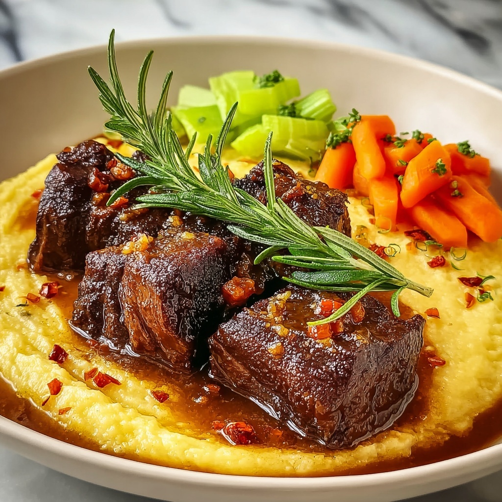 Tender beef short ribs braised in apple cider with aromatic herbs, served over creamy rosemary mashed sweet potatoes. This comforting dish combines rich flavors and fall-off-the-bone meat with a subtly sweet and herby side, perfect for a cozy dinner.