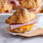 These Baked Ham and Cheese Croissants are a deliciously warm and gooey snack or breakfast option featuring mini croissants filled with smoked cheddar cheese and deli ham. Brushed with a flavorful butter-mustard-honey glaze, topped with poppy seeds, then baked until golden and melty, they offer a perfect balance of savory and slightly sweet flavors in a flaky pastry.