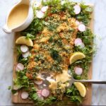 Mix the toasted panko with melted butter, grated Parmesan, chopped parsley and dill, lemon zest, salt, and pepper. This flavorful crumb will form the delicious crust that’s crispy and beautifully aromatic.