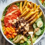 This Beef Burger Bowl goes wonderfully with simple side dishes like baked sweet potato fries, a crisp cucumber salad, or even crispy air-fried potato cubes for a fun “loaded” bowl vibe. If you want to keep it super low-carb, skip the fries and stick with veggie-packed sides.