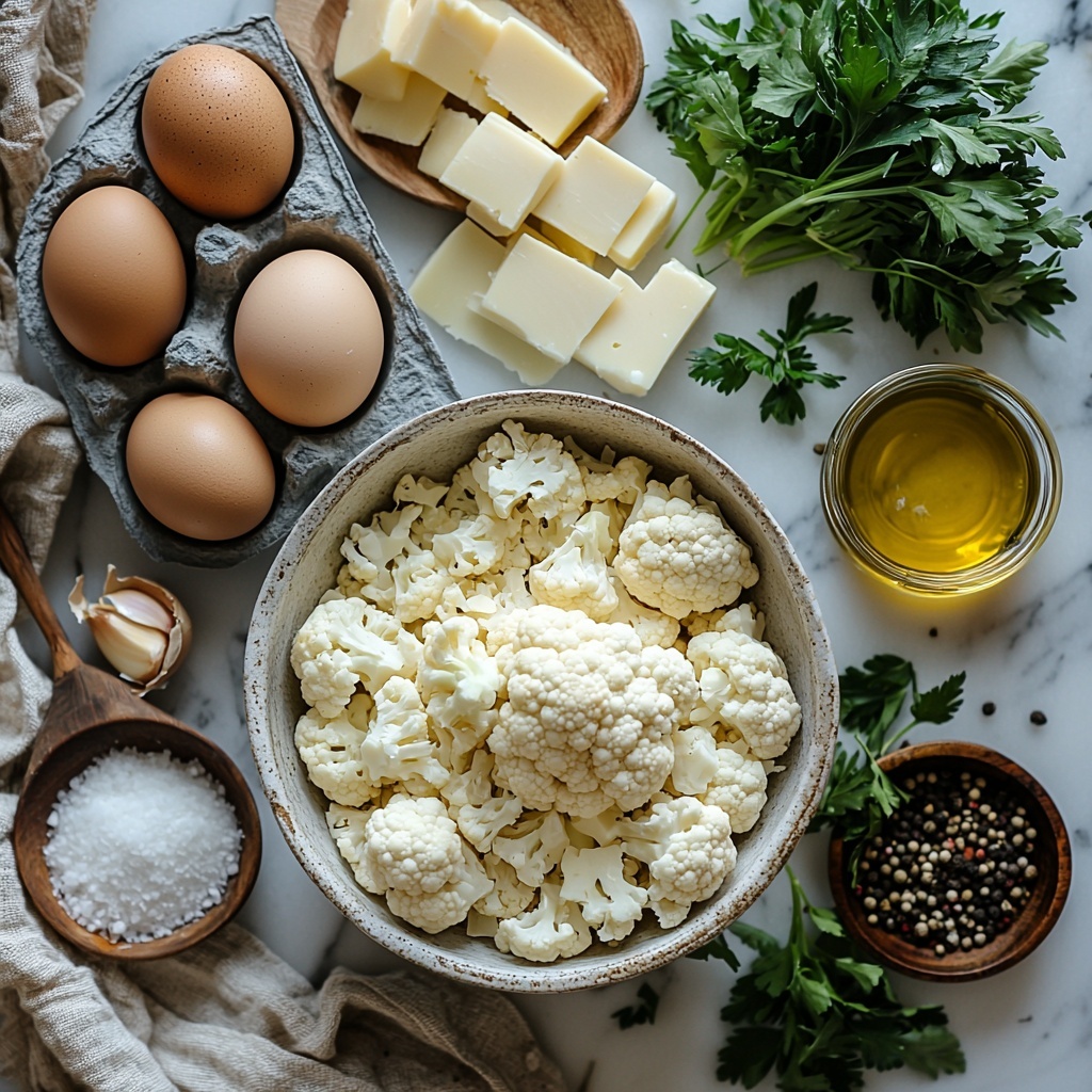 - Mix Ingredients: In a mixing bowl, combine the chopped cauliflower, eggs, all-purpose flour, grated Parmesan cheese, minced garlic, salt, black pepper, and chopped fresh parsley or dill. Mix well to form a batter-like consistency.