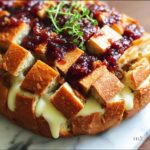 This Cranberry Brie Pull-Apart Bread is a delightful and festive appetizer perfect for gatherings. Featuring a round sourdough or French boule sliced in a crosshatch pattern and stuffed generously with creamy Brie cheese and tangy cranberry sauce, it’s drizzled with melted butter and baked to golden perfection. The melted Brie oozes out with each pull, complemented perfectly by the fruity cranberry and the herbaceous hint of fresh thyme. A warm, cheesy, and fruity treat that’s easy to prepare and sure to impress your guests.