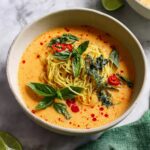 This Creamy Curry Coconut Noodle Soup is a vibrant and fragrant dish featuring tender rice noodles soaked in a rich coconut milk and red curry-spiced broth, enhanced with fresh herbs and a spicy kick from Fresno chilies. Perfect for a quick, comforting meal with bold Southeast Asian flavors.