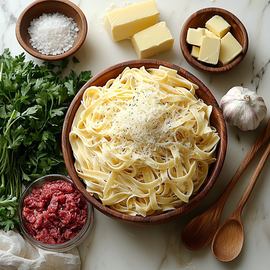 The magic of this Creamy Parmesan Beef Fettuccine with Garlic Butter Sauce Recipe comes from a handful of simple ingredients that each play an important role in the final dish. These components deliver rich textures, bold flavors, and a beautiful balance of creaminess and savoriness.
