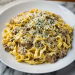 Creamy Parmesan Beef Fettuccine with Garlic Butter Sauce is a rich and comforting pasta dish featuring tender ground beef cooked in a luscious garlic butter cream sauce. Tossed with perfectly al dente fettuccine and topped with freshly grated Parmesan and parsley, this dish delivers satisfying flavors in just 30 minutes, making it an ideal weeknight dinner.