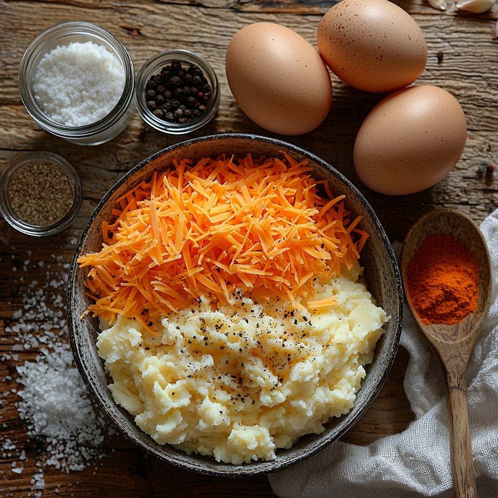 The magic of this Crispy Mashed Potato Cheese Puffs Recipe lies in its simple yet thoughtfully chosen ingredients. Each item plays a key role in creating the perfect balance of flavor, texture, and color—from the creamy mashed potatoes and sharp cheddar to the golden breadcrumbs that provide that signature crunch.