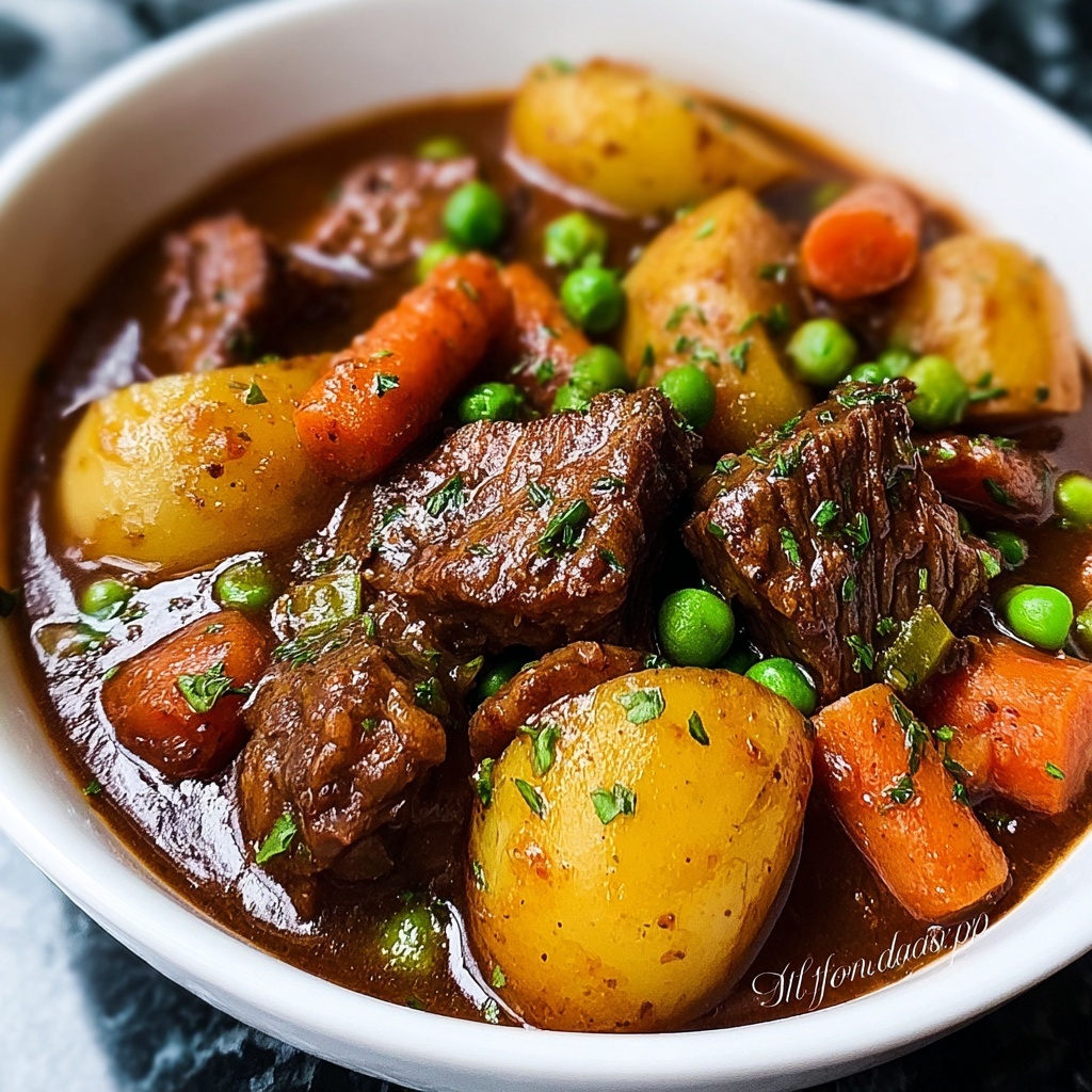 This comforting Crockpot Beef Stew is a hearty and flavorful dish perfect for a cozy meal. Tender beef cubes slow-cooked with golden Yukon potatoes, carrots, onions, and seasoned beef broth create a rich and savory stew. Finished with sweet peas and a cornstarch slurry for a thickened, luscious gravy, this recipe is simple to prepare and cooks gently in the crockpot, allowing all the flavors to meld beautifully.
