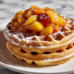 Delight in these crispy and golden French Toast Waffles served with a sweet and tangy homemade peach sauce. This breakfast recipe combines the rich flavors of traditional French toast with the delightful texture of waffles, creating a perfect brunch treat topped with a luscious fruit sauce made from fresh or frozen peaches.