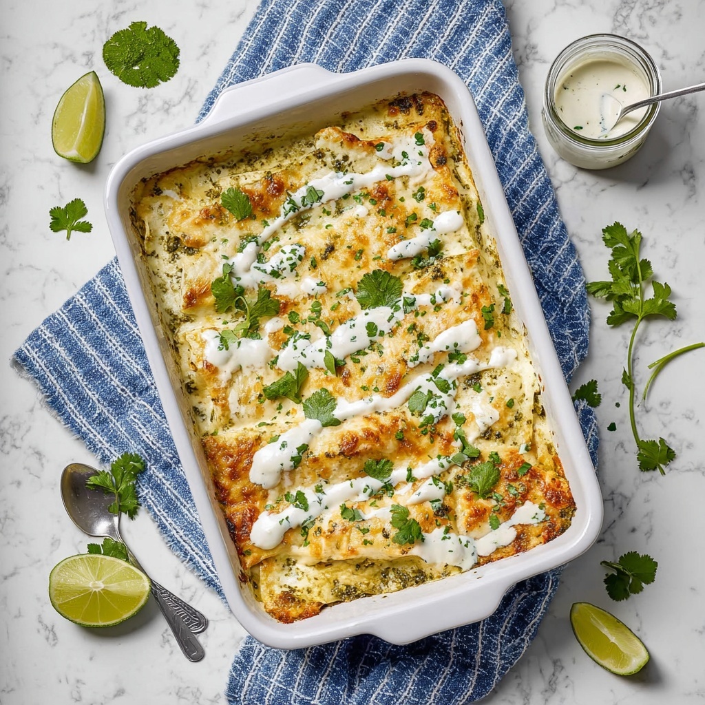 These Green Chicken Enchiladas feature a vibrant tomatillo and cilantro sauce combined with tender shredded chicken, sweet corn, and melty Monterey Jack cheese, all wrapped in warm corn tortillas and baked to golden perfection. This flavorful Mexican-inspired dish is perfect for a comforting family dinner or casual entertaining.