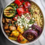 A vibrant and healthy Mediterranean bowl featuring fluffy quinoa, smoky grilled vegetables, protein-packed chickpeas, and a refreshing lemon-parsley dressing. Perfect for a nutritious lunch or dinner, this recipe offers a delightful balance of flavors and textures with optional feta cheese adding a creamy finish.