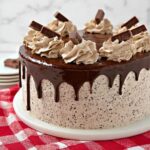 This Hershey Bar Cake is an indulgent layered dessert featuring moist German Chocolate cake layers combined with creamy vanilla pudding, rich cream cheese frosting, and decadent Hershey chocolate bars incorporated throughout. Finished with chocolate sprinkles and mini Hershey bars for decoration, this cake is perfect for chocolate lovers seeking a festive and delicious treat.