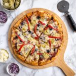 This homemade veggie pizza recipe features a crisp, golden crust topped with vibrant baby spinach, mozzarella cheese, black olives, marinated artichoke hearts, red bell pepper, and red onion. Baked to perfection on a pizza stone at 450ºF, this flavorful and colorful pizza offers a delightful balance of fresh vegetables, melted cheese, and savory pizza sauce, perfect for a wholesome and satisfying meal.