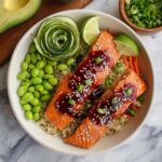 These Honey Sriracha Salmon Bowls combine tender, oven-baked salmon glazed with a sweet and spicy honey sriracha sauce with a nutritious base of quinoa or rice and fresh vegetables for a vibrant, flavorful meal that’s perfect for a healthy weeknight dinner.