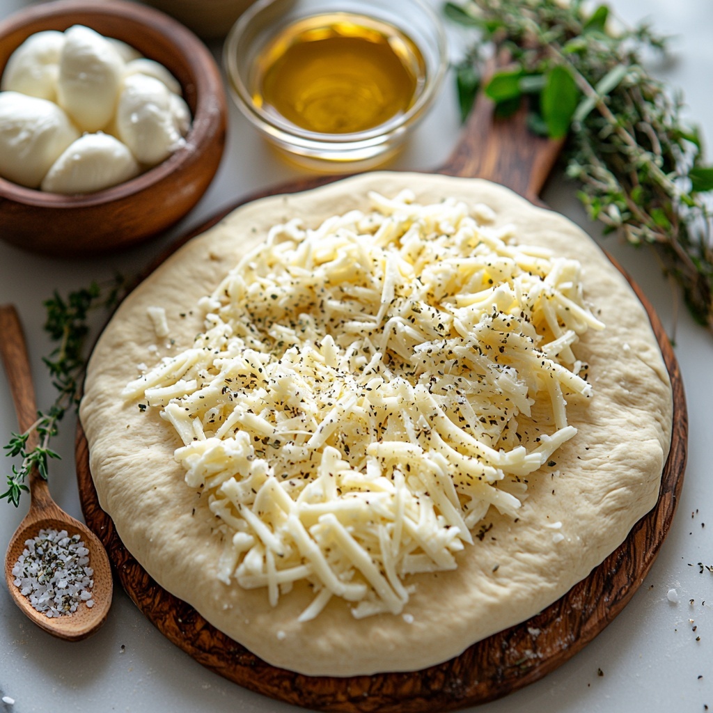 5. Add Cheese and Herbs: Sprinkle the shredded mozzarella cheese evenly over the dough, then add the grated Parmesan cheese on top, followed by a light dusting of dried Italian herbs for a fragrant finish.