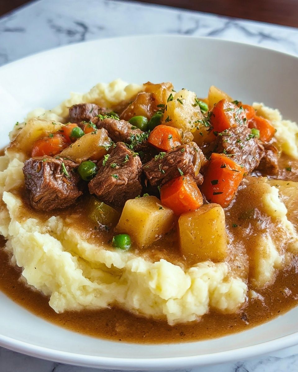 For a rustic touch, serve the stew in individual cast-iron skillets or bowls placed on top of the mashed potatoes. Another fun idea is to pipe the mashed potatoes using a star tip around the edge of the plate and spoon the stew in the center, giving a restaurant-style flair that’s sure to impress.