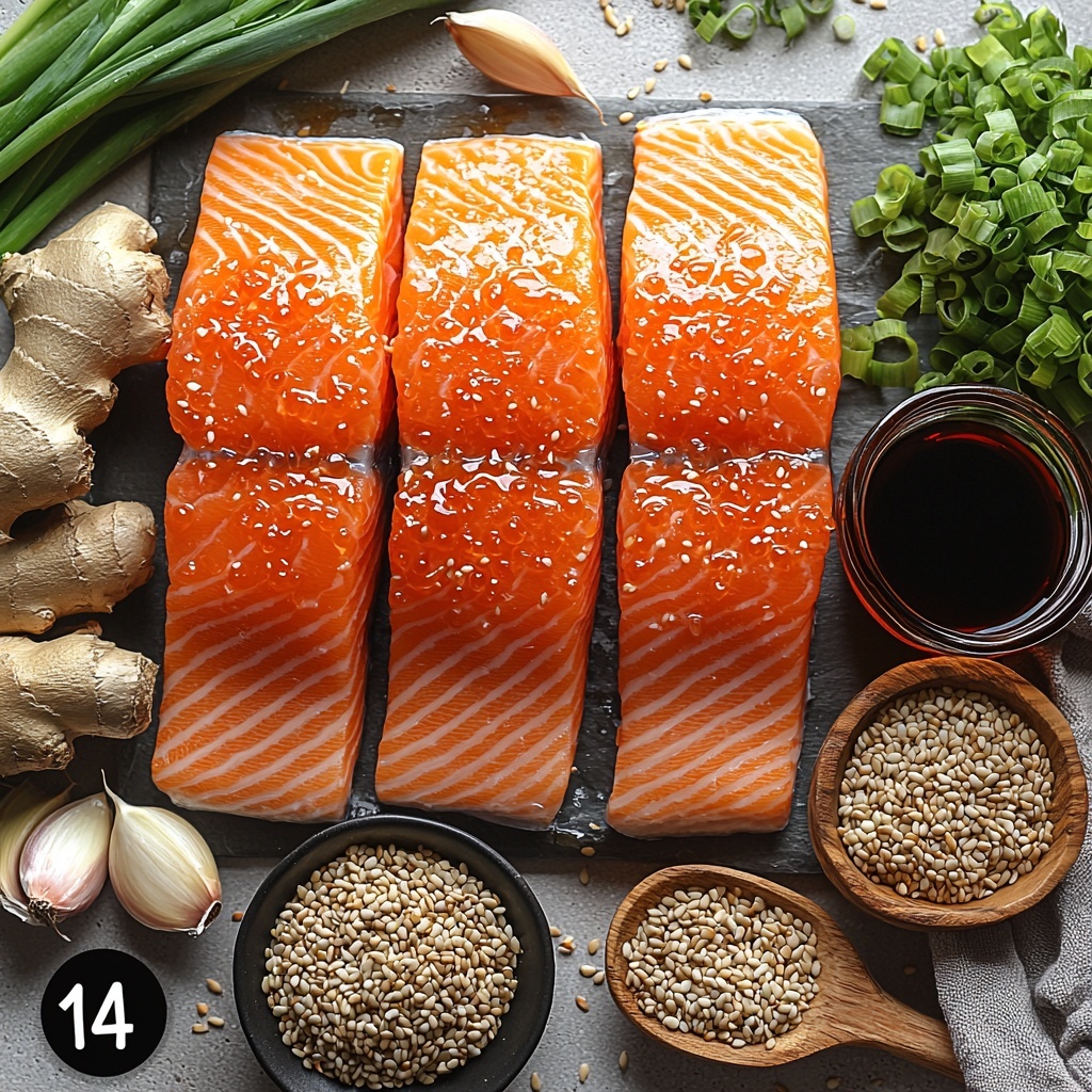 The beauty of this recipe lies in its straightforward, essential ingredients that perfectly balance sweet, tangy, and umami tones. Each component plays a crucial role, from the rich soy sauce to the fresh zing of ginger, crafting a marinade that infuses the salmon with layers of flavor and gives it that irresistible shine and aroma.