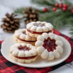 Once cooled, gently separate each top from its matching bottom cookie. Spread about half a tablespoon of raspberry jam on the solid bottom cookie, then sandwich it with the snowflake-cut top. Finish with a generous sprinkle of powdered sugar for that signature sweet touch and beautiful presentation.