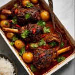 This Lamb Shanks Massaman Curry is a rich and aromatic Thai-inspired dish featuring tender lamb shanks slow-baked in a flavorful Massaman curry sauce with coconut milk, spices, potatoes, and onions. The curry is slow-cooked in the oven until the meat is fall-apart tender and the sauce thickens to a luscious, syrupy consistency. Served over steamed jasmine rice and garnished with fresh coriander and sliced red chili, this hearty dish is perfect for a comforting family meal or special occasion.