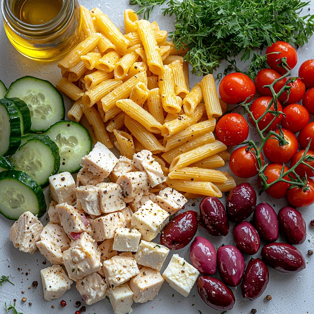 Gathering these ingredients is simpler than you might think, yet each one plays a crucial role in building the bold, refreshing character of this salad. From the protein-packed chicken to the creamy feta and zesty olives, every element enhances the dish’s taste, texture, and color.