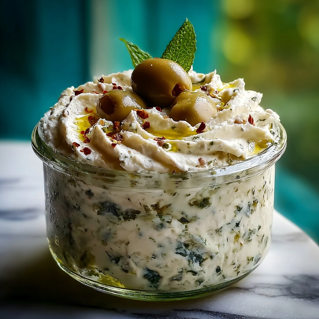 - Transfer and Garnish: Spoon the creamy dip mixture into a serving bowl or jar. Drizzle a little additional extra virgin olive oil over the top for richness, then place the whole green olives as a charming garnish to enhance visual appeal.