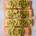 This Pesto Salmon Recipe features tender, flaky salmon fillets baked with a flavorful basil walnut pesto topping. The salmon is enhanced with a splash of white wine and fresh lemon juice for a bright, savory finish, then garnished with crunchy chopped walnuts for added texture. Perfectly simple and elegant, this dish is ready in just 20 minutes, making it an ideal healthy dinner option.