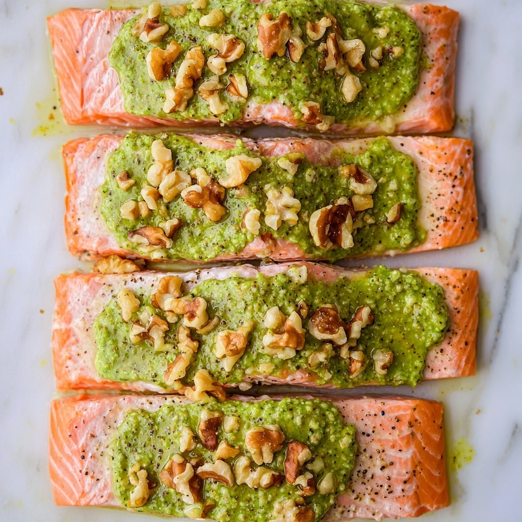 For a sophisticated touch, serve the salmon on a bed of mixed greens lightly dressed with lemon vinaigrette to keep things fresh and crisp. Drizzling extra pesto along the plate edges or adding a sprinkle of extra walnuts creates a restaurant-quality presentation that’s sure to impress your guests.