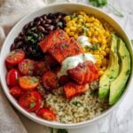 A flavorful and healthy Salmon Burrito Bowl featuring baked salmon seasoned with a blend of chili powder, cumin, and smoked paprika, served over rice with black beans, corn, fresh vegetables, and topped with avocado, lime juice, and optional sour cream or salsa. This Mexican-inspired dish is perfect for a quick, nutritious meal that can also be easily customized and prepped ahead.