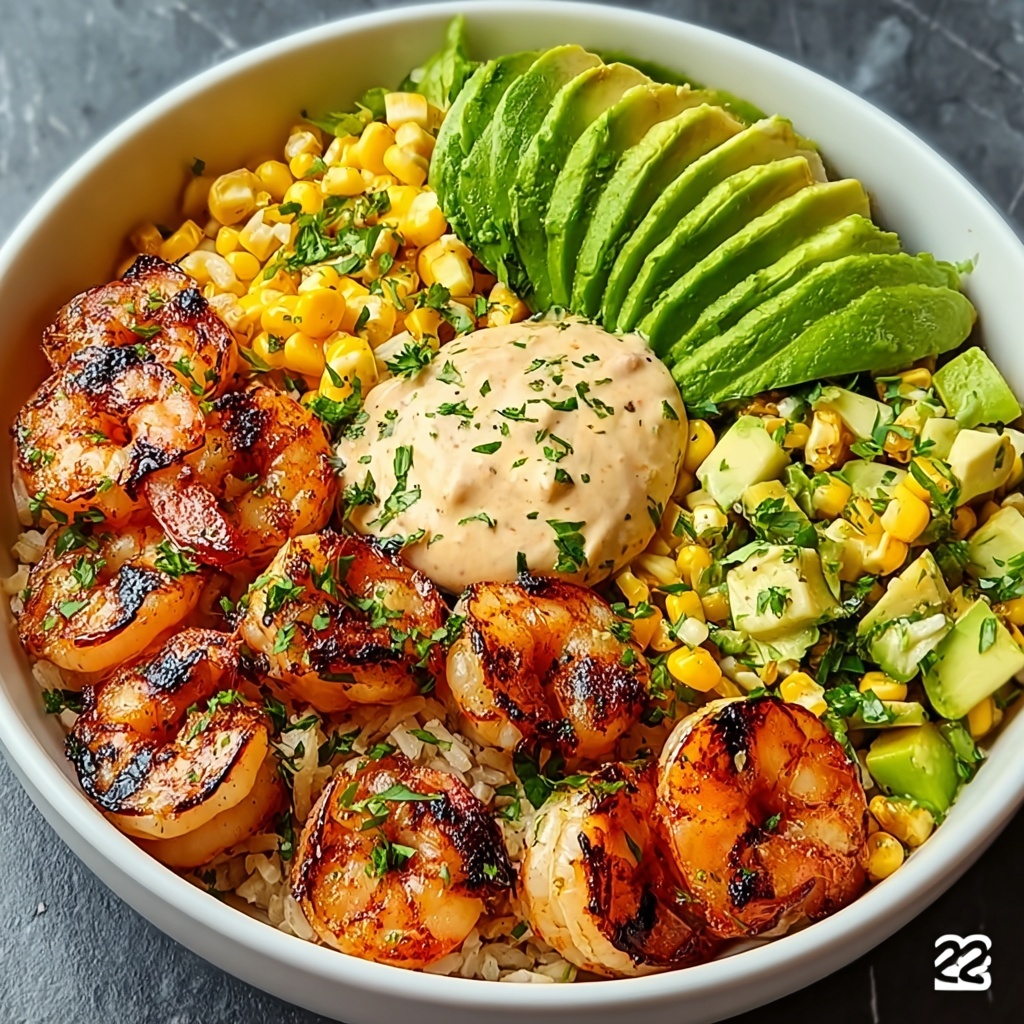 - Assemble the Bowl: Divide the corn salsa among serving bowls, top it with the grilled shrimp, add diced avocado, and drizzle the creamy sauce on top. Serve immediately for the best flavor and texture.