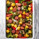 This Sheet Pan Sausage and Potatoes recipe is a quick and easy one-pan dinner featuring tender baby potatoes, vibrant green beans, broccoli florets, red bell peppers, mushrooms, onions, and smoked sausage all roasted together with Italian seasoning and paprika. The veggies and sausage are tossed in olive oil and spices, baked until golden and caramelized, then served with optional toppings like grated Parmesan, lemon juice, and fresh parsley, making it a flavorful, hearty, and fuss-free meal perfect for busy weeknights.