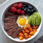 - Assemble the Plate: Arrange the roasted sweet potato halves on a plate. Place the sliced steak on top of the sweet potato. Add the sunny-side-up eggs alongside. Garnish with diced avocado and scatter the fresh raspberries and blueberries on the plate for a burst of color and flavor.