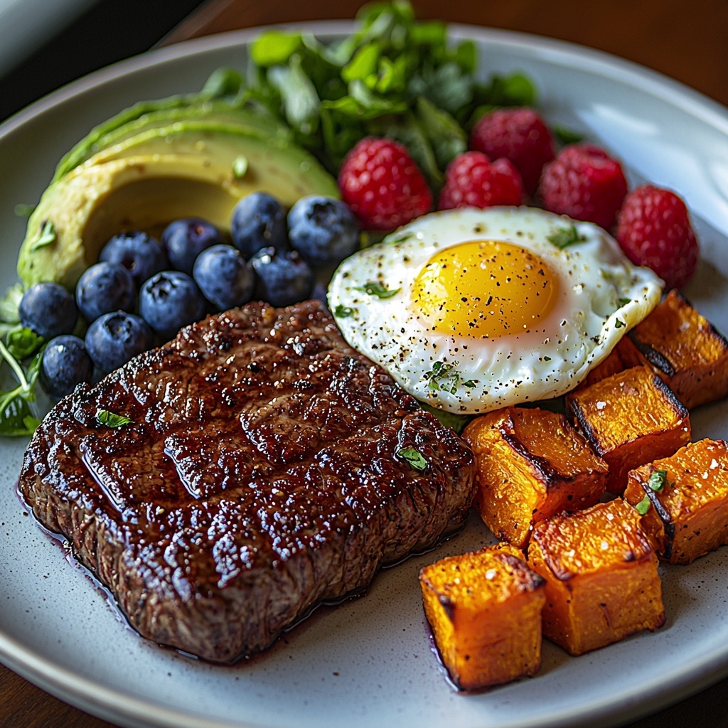 A nutritious and hearty power plate combining a perfectly seared steak, sunny-side-up eggs, roasted sweet potato, creamy avocado, and fresh berries. This balanced meal packs protein, healthy fats, and antioxidants, making it ideal for a wholesome breakfast or brunch.