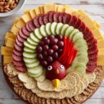 - Create Cucumber Rows: Lay a few rows of cucumber slices above the salami to mimic the turkey’s back feather section. Lift the pear half and fan small Ritz crackers in a circle to support the pear head.