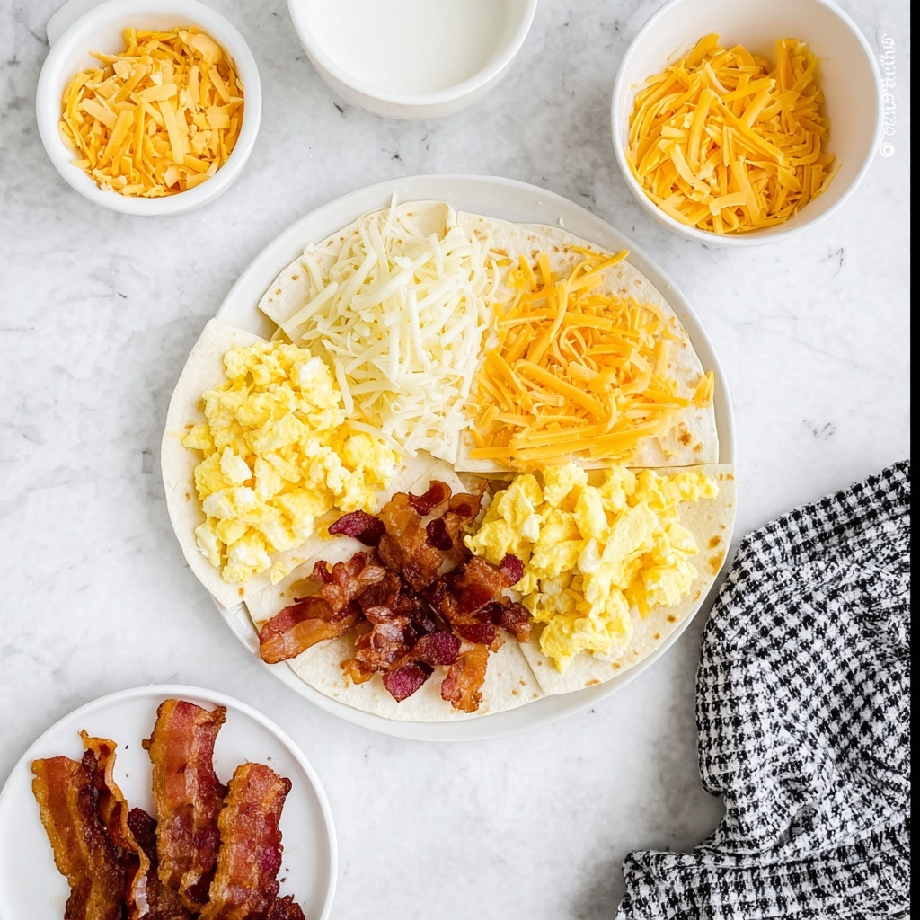 Begin folding by flipping quadrant 1 (with the bacon) over quadrant 2, then continue folding clockwise until you’ve sealed your quesadilla into a compact triangle. This folding technique is what makes the Tik Tok Famous Breakfast Quesadillas Recipe truly unique and visually fun.