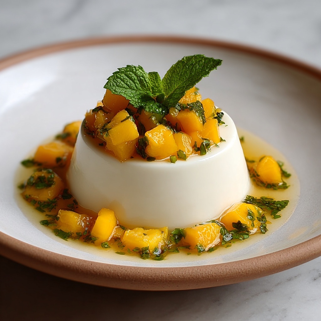 9. Garnish and Serve: Spoon a thin layer of the mango-lime puree on top of each set panna cotta and garnish with fresh mint leaves if desired.