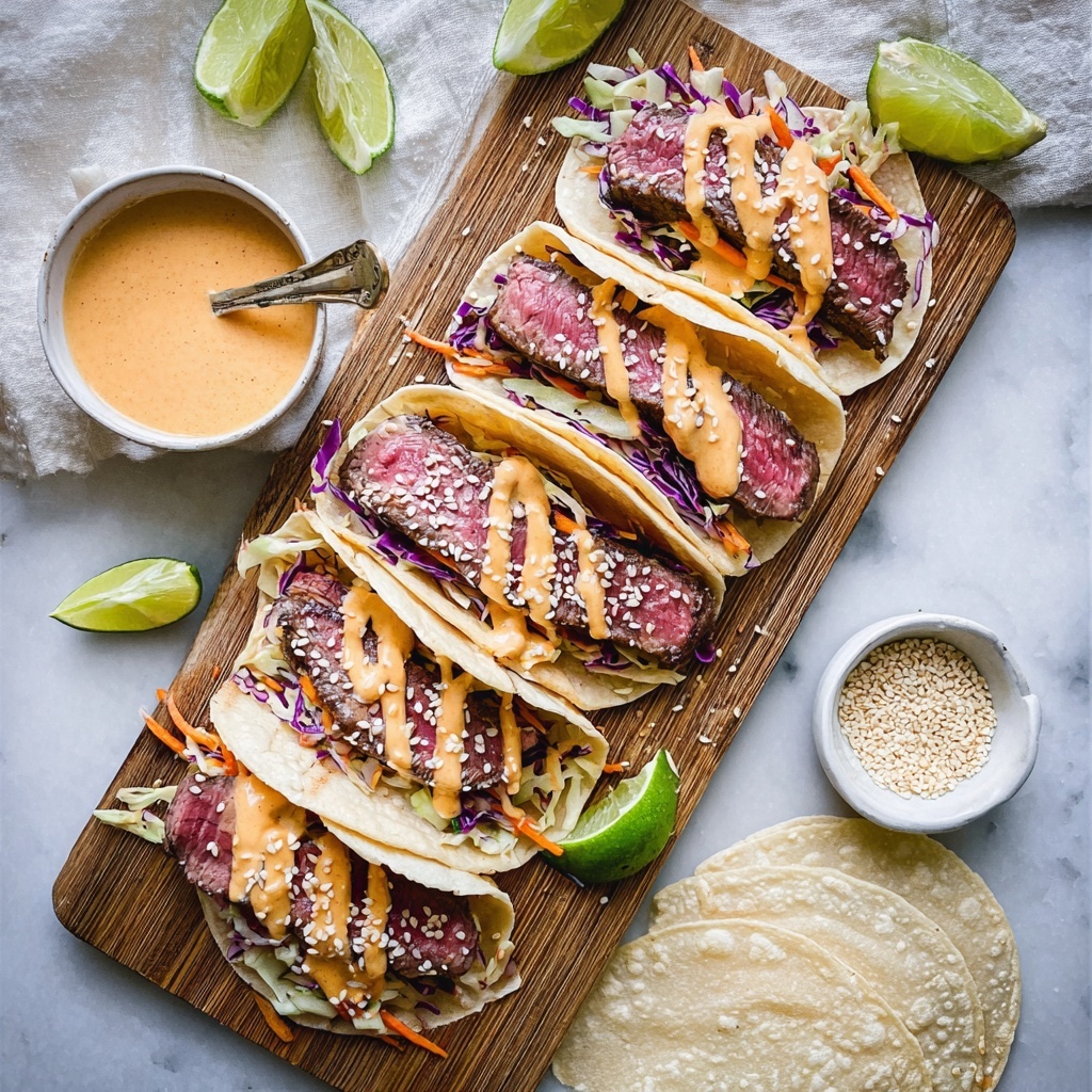 For a casual party, serve the tacos deconstructed in bowls—one for cabbage coleslaw, one for sliced tuna, and small ramekins of sriracha mayo and sesame seeds—letting guests build their own tacos. Alternatively, arrange the tacos on a colorful platter garnished with lime wedges and fresh herbs, inviting everyone to dig in. Either way, this Tuna Steak Tacos with Sriracha Mayo and Cabbage Coleslaw Recipe shines as the centerpiece of any joyful gathering.