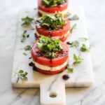 - Add fresh herbs and microgreens: Garnish the top of each stack with roughly chopped basil, mint, and microgreens for added freshness, flavor, and color.